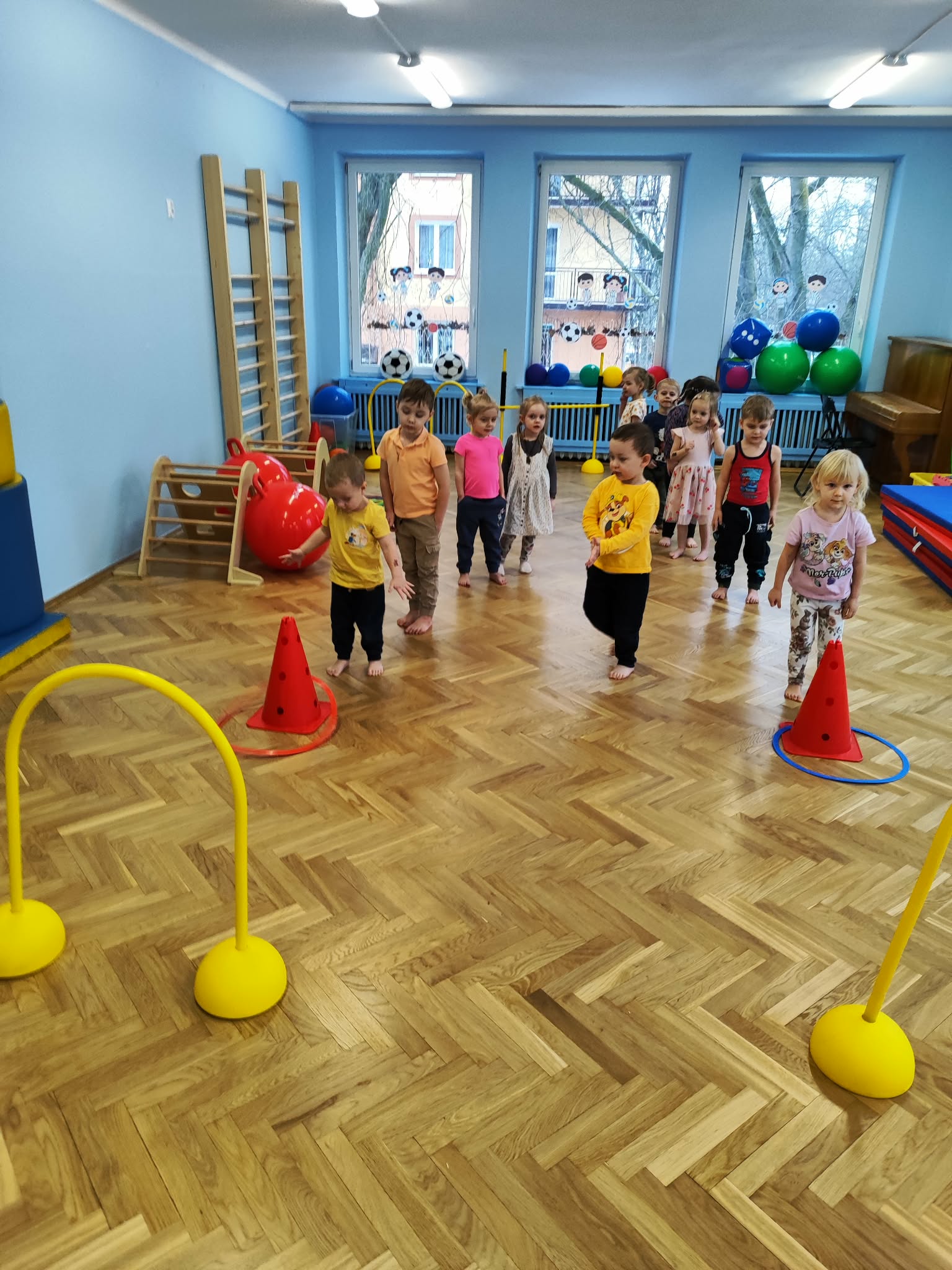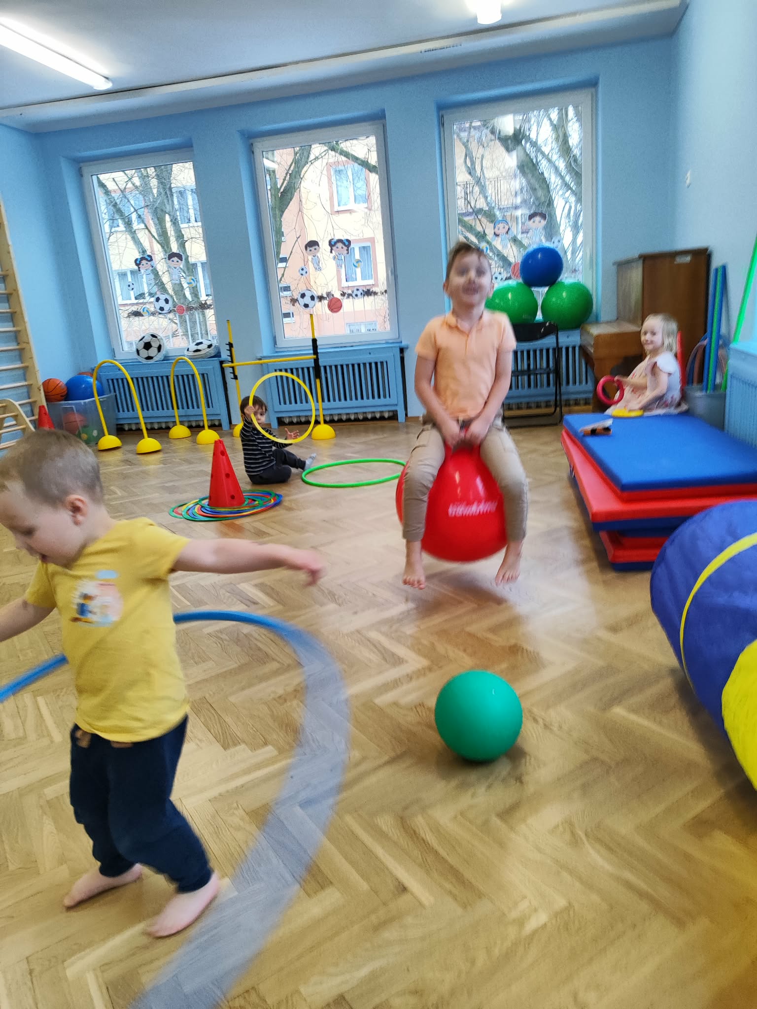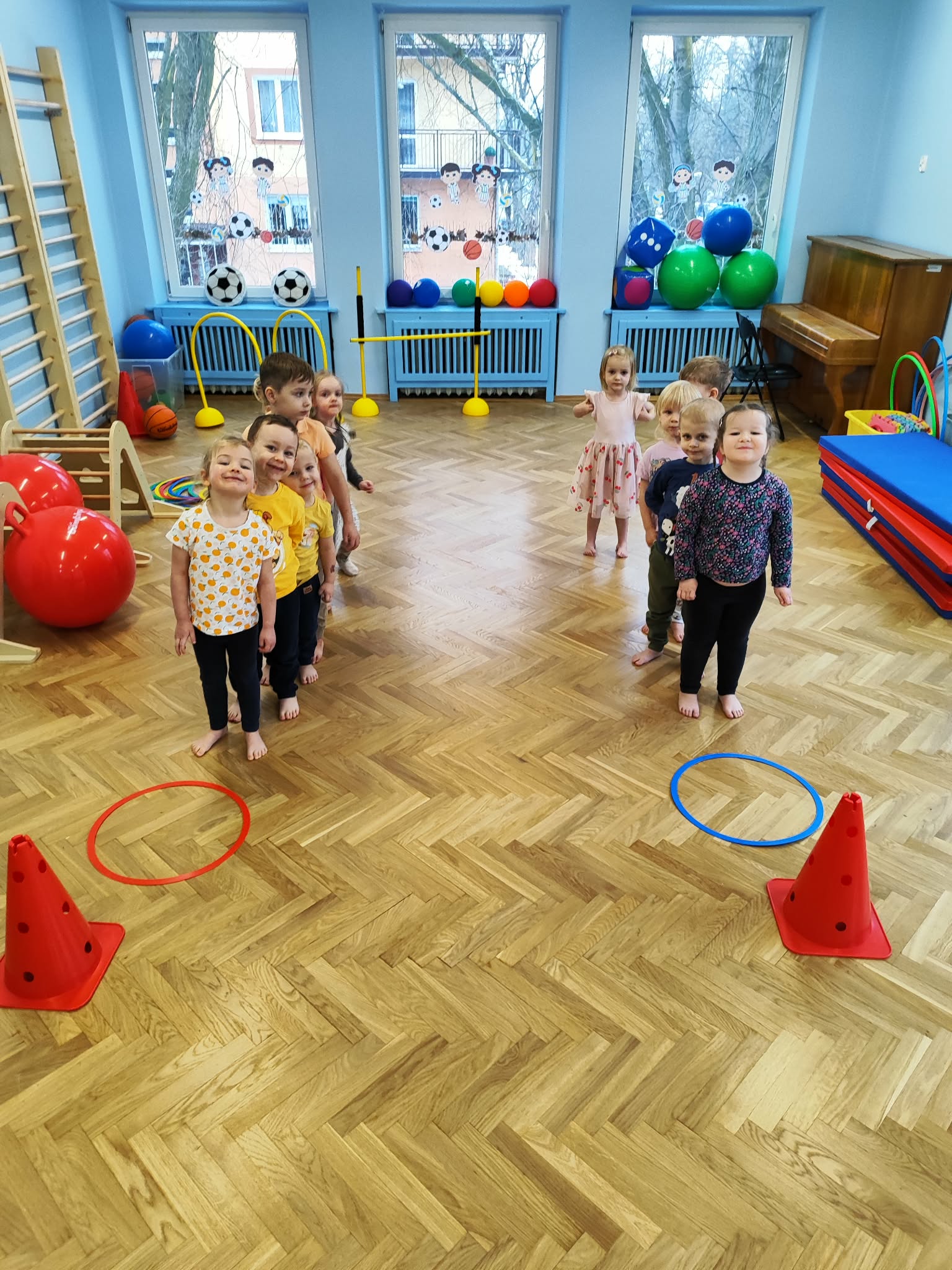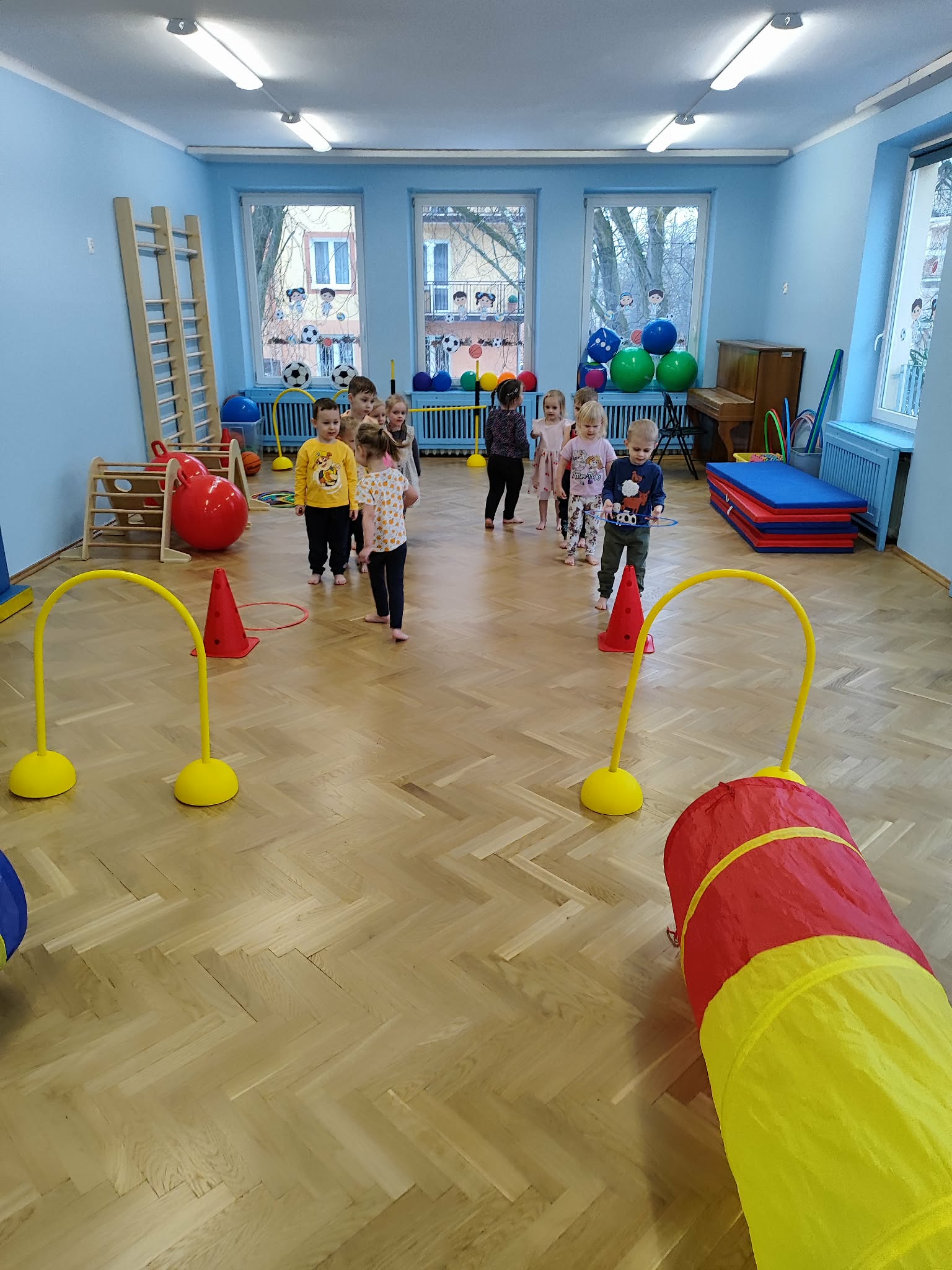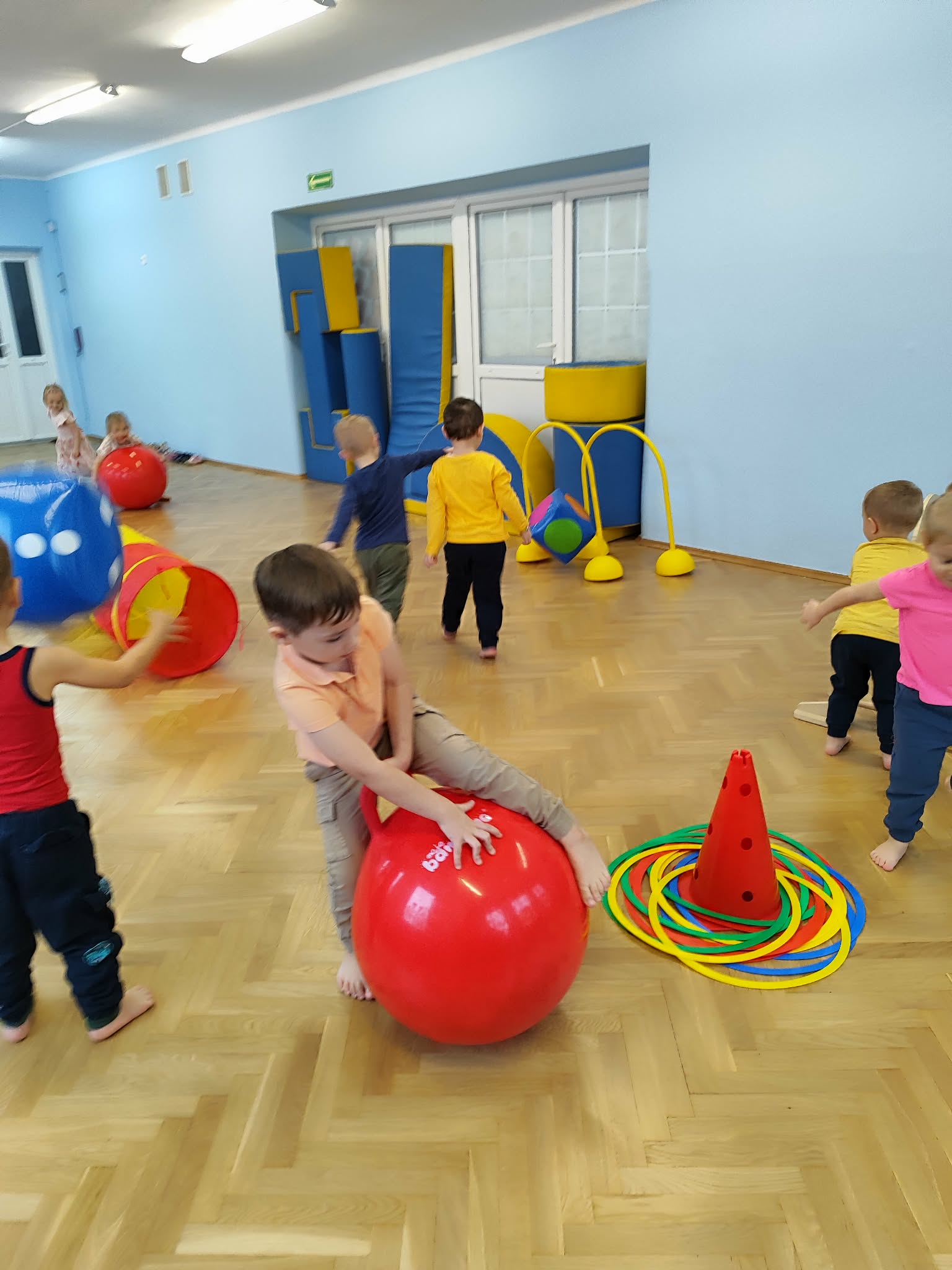 Ruch to zdrowie, dlatego od najmłodszych lat warto dbać o zabawy ruchowe dla dzieci. Maluchy do aktywności nie potrzebują drogiego sprzętu, czy też specjalnych strojów – wystarczy wspaniale urządzona sala gimnastyczna w naszym przedszkolu ;)