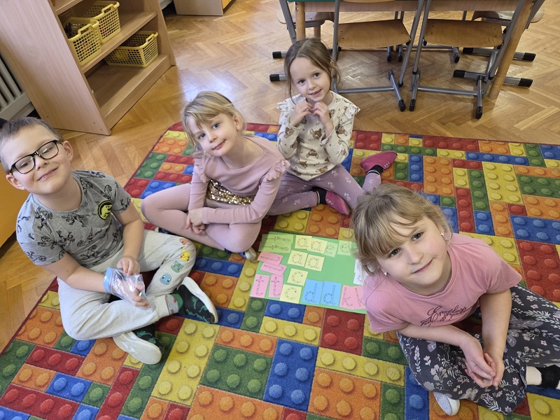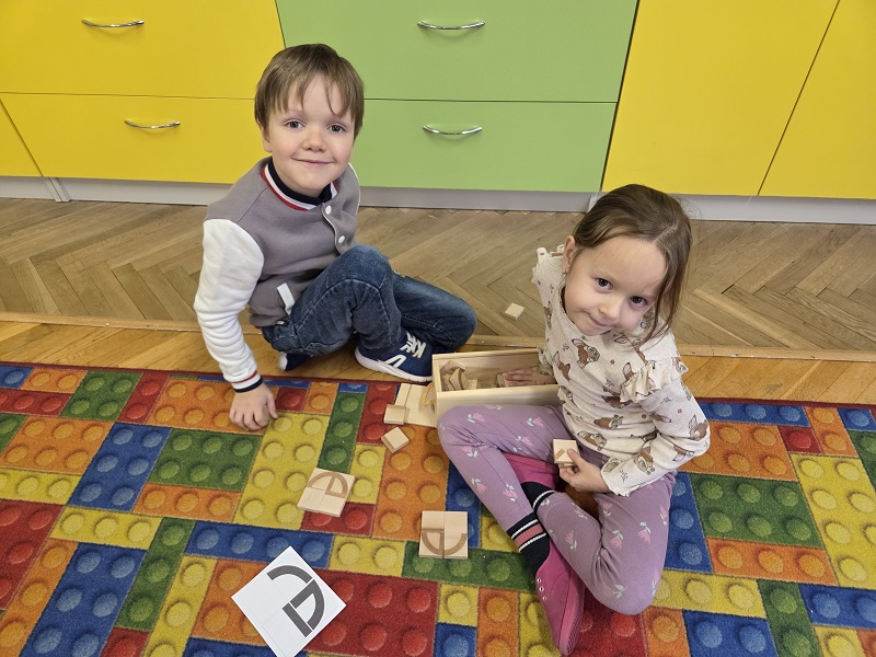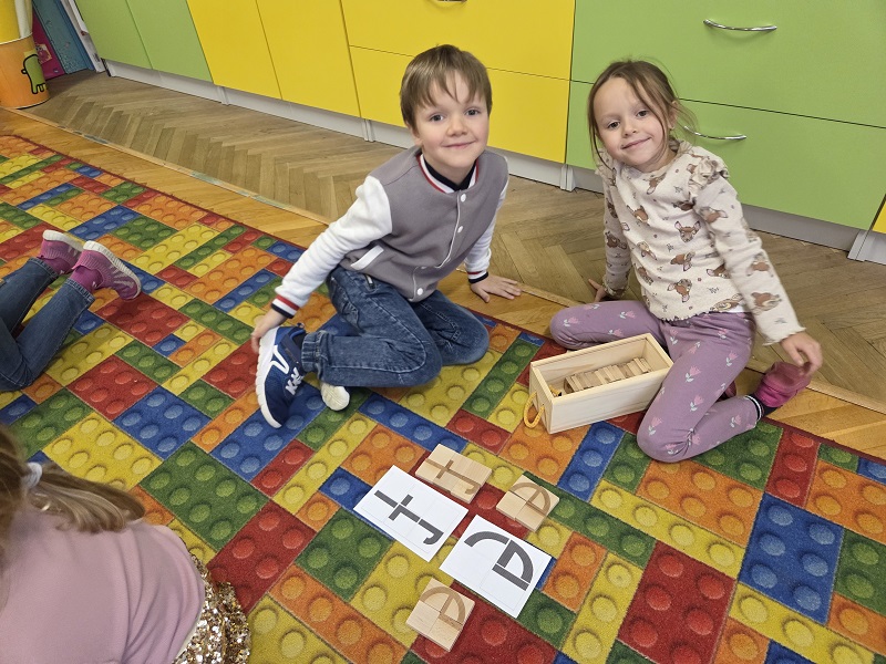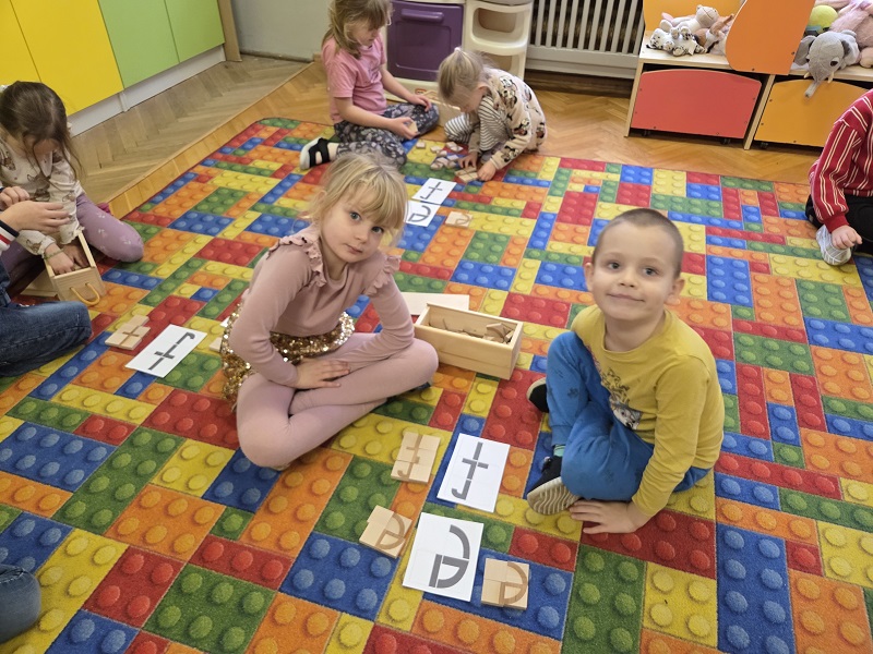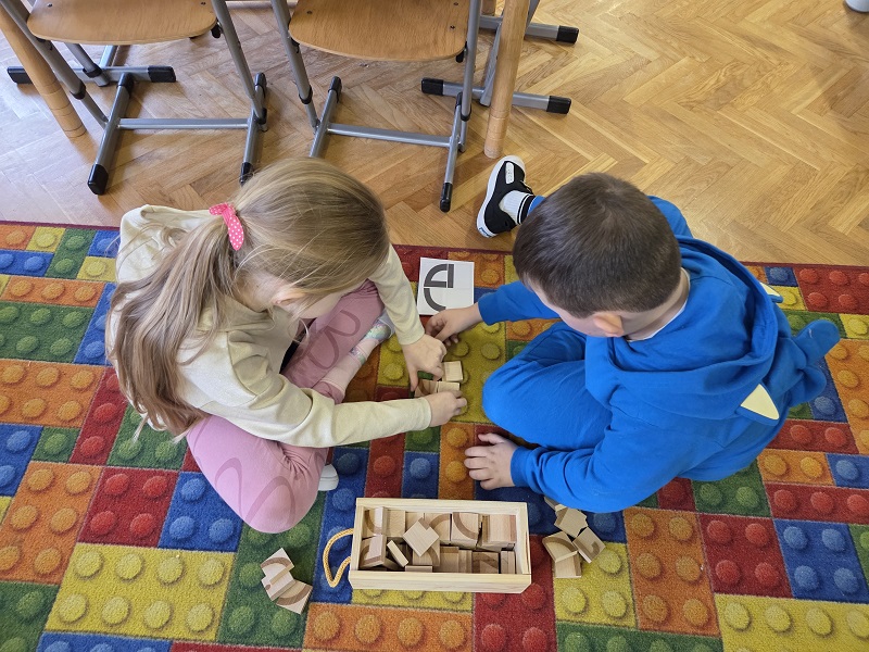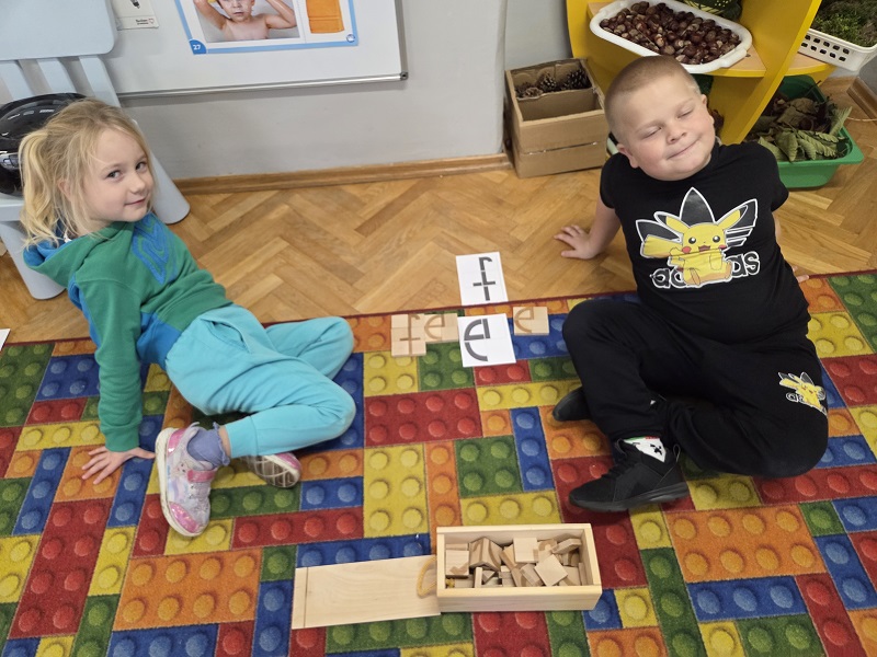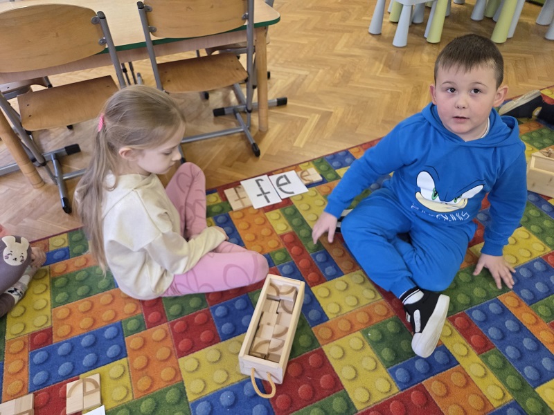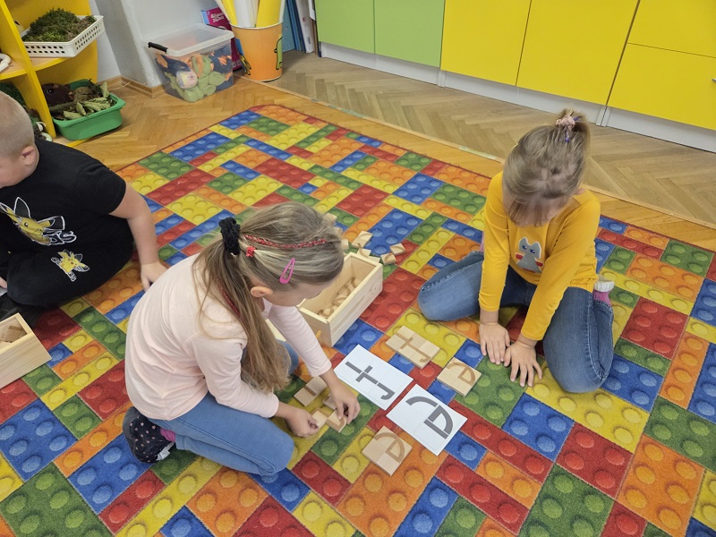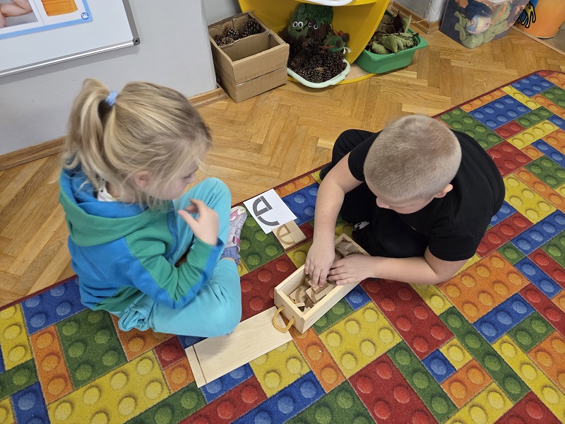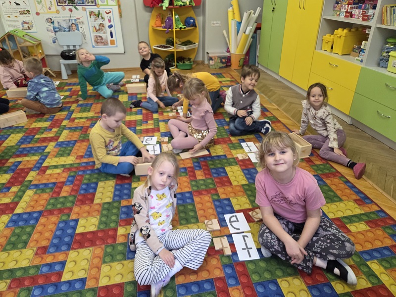 Grupa Biedronek w dniu 18 listopada 2025 r. uczestniczyła w ćwiczeniach i zabawach – “Jaka to głoska ?”, “Literowe pary”, “Odszukaj literę”, “Mała i duża litera”, “Usłysz i odszukaj”, w ramach realizacji Innowacji pedagogicznej “Skuteczne zdziwienie - wyzwalające myślenie”. Przedszkolaki przypomniały sobie symbol graficzny i gest liter – E jak Elf oraz F jak Foka oraz układały je z drewnianych klocków.