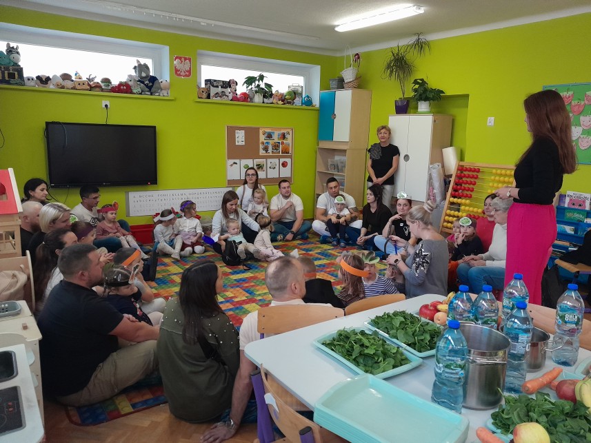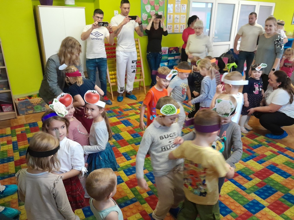 22 października w naszej grupie odbyły się wyjątkowe zajęcia otwarte z rodzicami, podczas których dzieci i dorośli wspólnie odkrywali tajniki zdrowego stylu życia. Spotkanie rozpoczęła Pani dietetyk Magdalena Wesołowska, która w ciekawy i przystępny sposób opowiedziała o zasadach zdrowego odżywiania dzieci. Następnie wszyscy uczestniczyli w zabawach integracyjnych i tematycznych, oczywiście z warzywami w roli głównej. Było dużo śmiechu, ruchu i wspólnej zabawy.