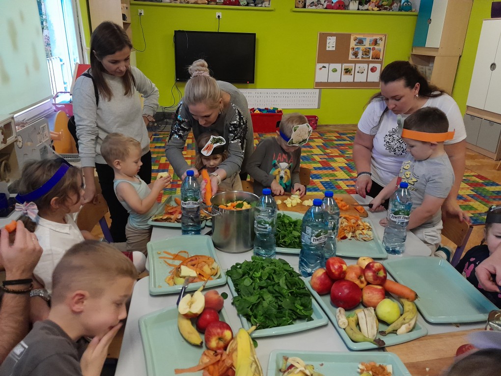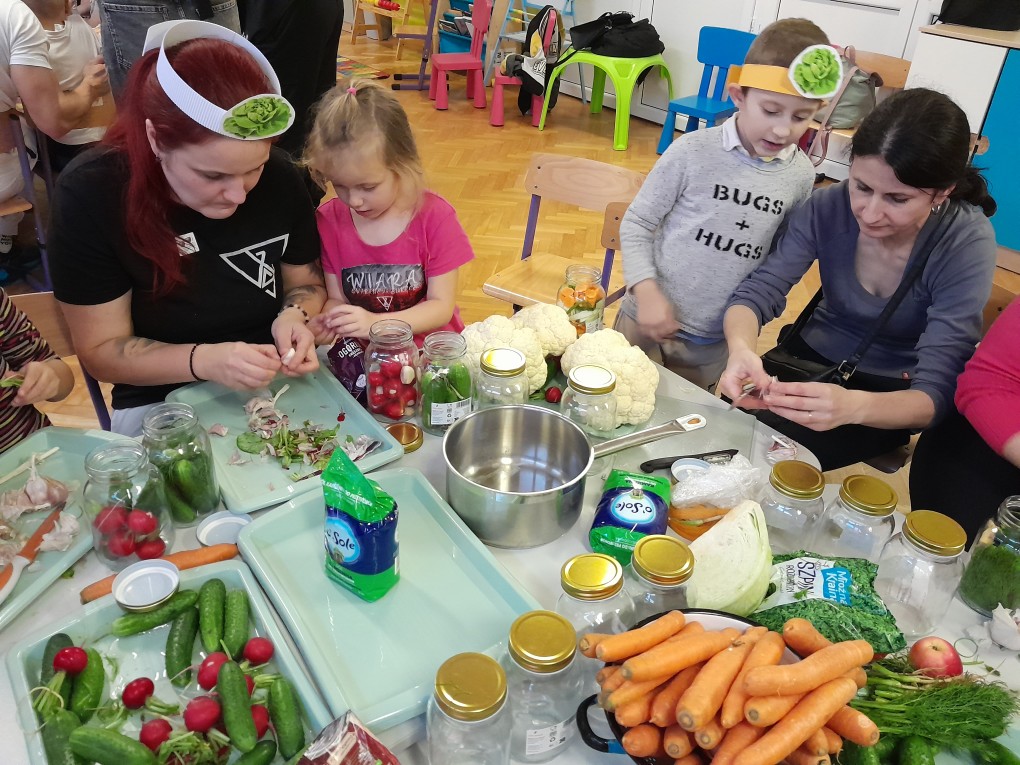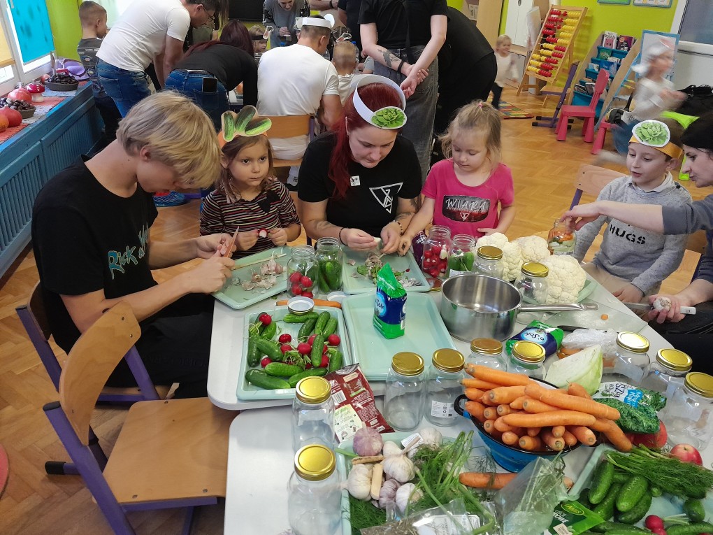 Kulminacyjnym punktem spotkania było wspólne gotowanie. Uczestnicy podzielili się na dwa zespoły - pierwszy przygotowywał przetwory: kiszone ogórki i sałatkę warzywną do słoików, a drugi tworzył kolorowe i zdrowe owocowo-warzywne koktajle.