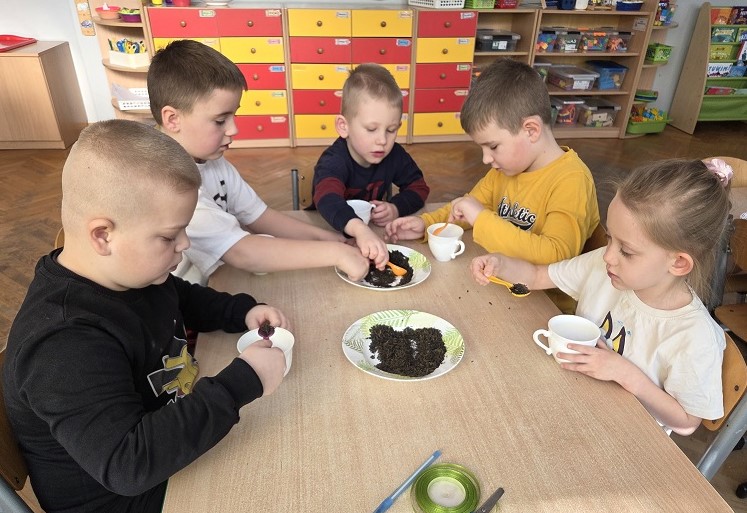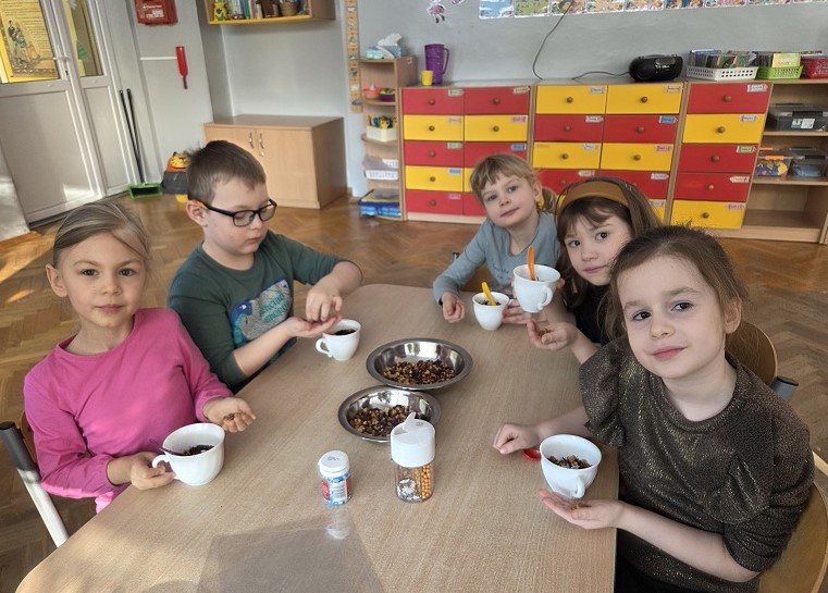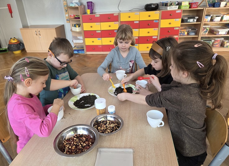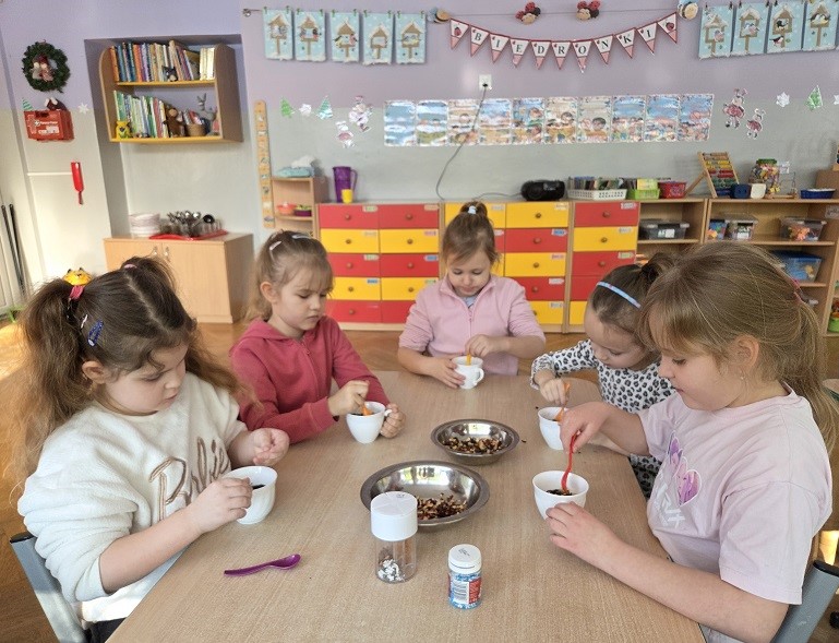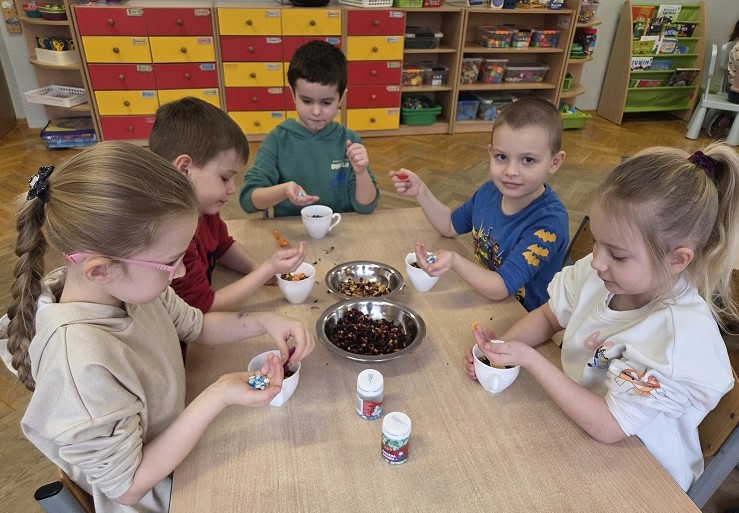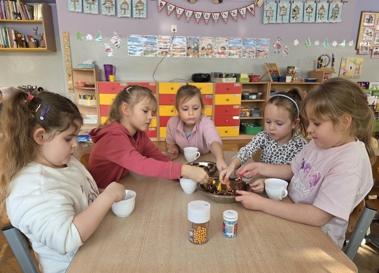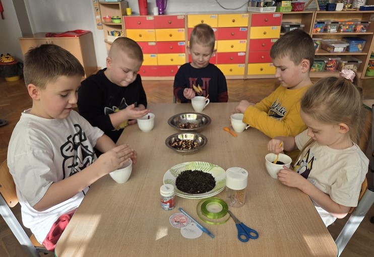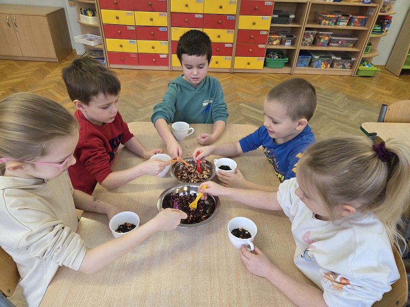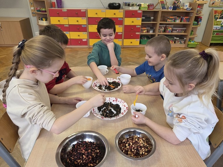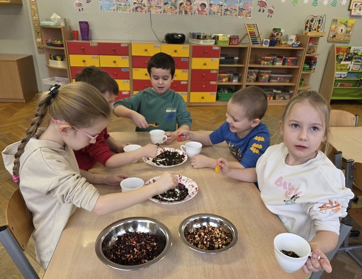 Przedszkolaki z grupy Biedronek przygotowywały zdrową, rozgrzewającą zimową herbatkę, z pomarańczą i imbirem, żurawiną lub maliną.