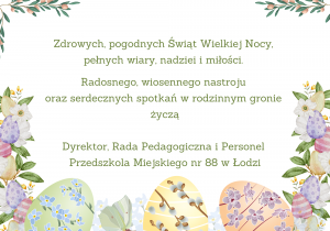 Zdrowych, pogodnych Świąt Wielkiej Nocy, pełnych wiary, nadziei i miłości. Radosnego, wiosennego nastroju oraz serdecznych spotkań w rodzinnym gronie życzą
